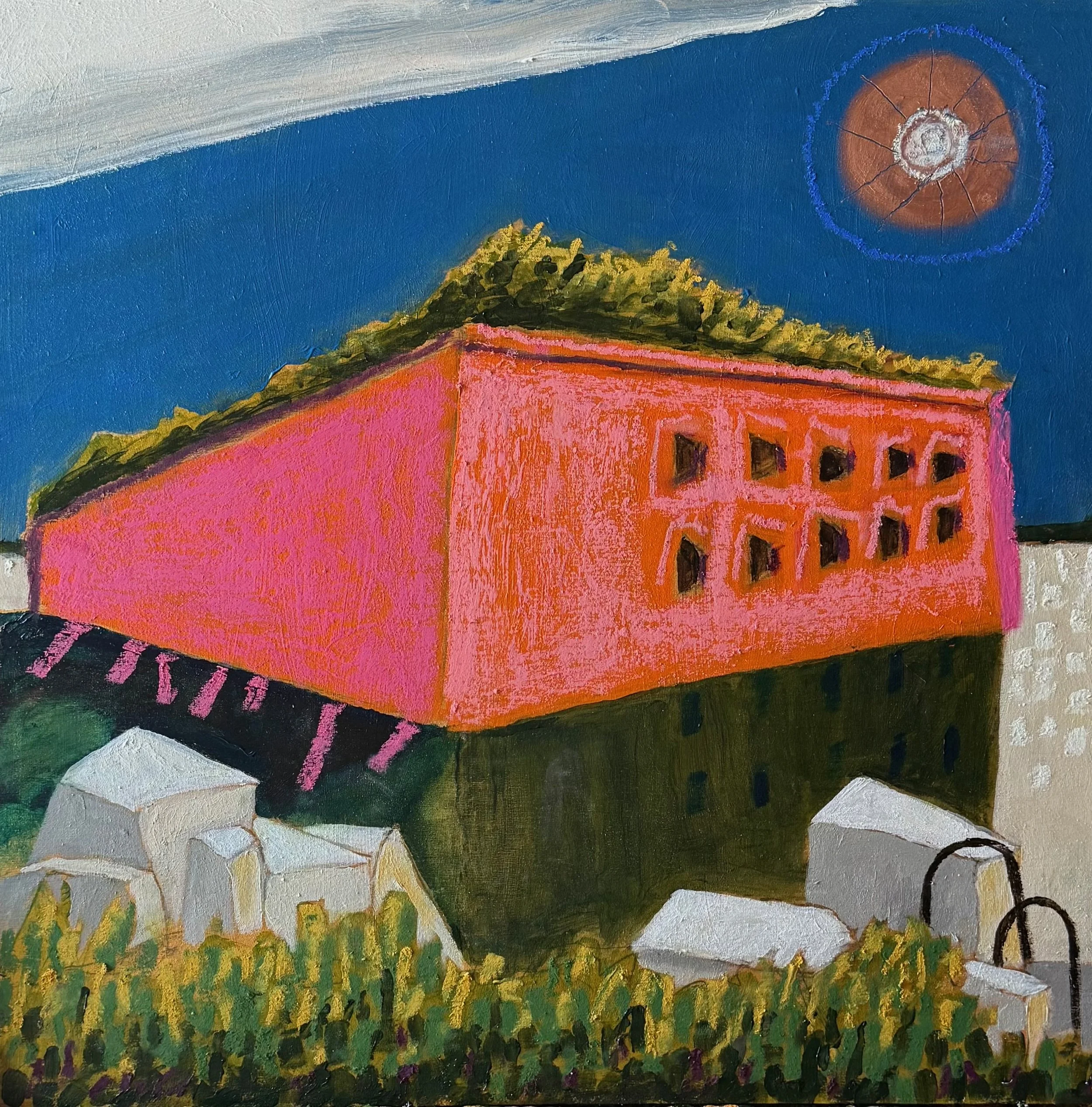 Alison Goodwin’s iridescent, bold, and vibrant paintings have delivered a playful exuberance and deep reverence to the Maine art world for 30 years. Growing up on the southern Maine coast and now living in Portland and Rockland, Goodwin is influenced by Hundertwasser, Klimt, Matisse and Calder. Consistently, her work is characterized by saturated, turbulent color and skewed perspectives in her compositions of unruly landscapes, expressive interiors, and kinetic villages.