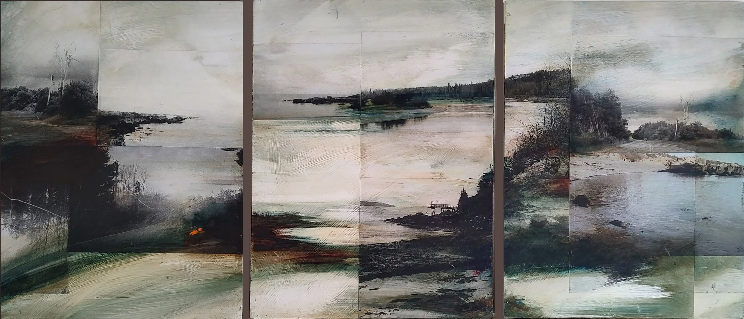Susan Barnes grew up in Alaska where the landscape was a constant inspiration. She received her MFA at SUNY Buffalo in New York in 1982. In addition, she attended Portland State University, University of Montana and the Rocky Mountain School of Photography. Her evocative landscapes combine elements of photography, collage and painting with a fluidity of motion expressed through her passionate hand. The sense of place Barnes creates is both expansive and introspective, much like the landscape she experienced during her youth spent in Alaska and Montana. Barnes’ thirty year tenure as an artist has brought her here to Maine where she creates unique and moving vistas using the mediums she loves; paint, collage and photography.