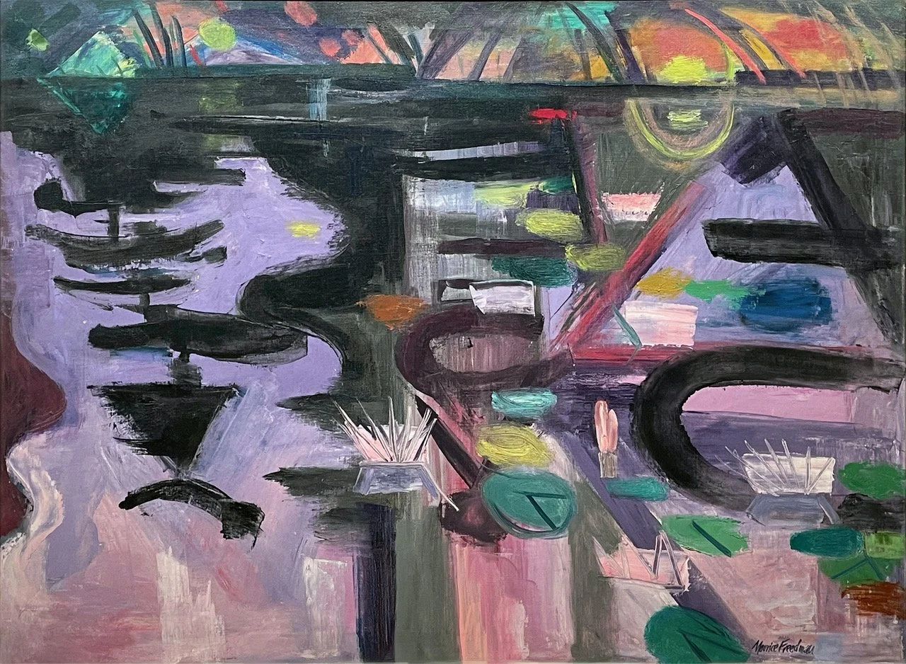 As his friends Marsden Hartley and John Marin discovered, Freedman found New York City best taken with a chaser of respite. For Freedman, his New England roots answered the call, Maine being chief among them. There he sought to recharge his energy and try new things. Freedman embraced the region’s proud seafaring past, as in the jewel-toned, “Enveloping Night,” and its fiercely beautiful, natural habitat as seen in “Mountain Stream” and “Forest Struggle,” He encapsulated the breathtaking, starkness of winter in works such as “Winter Formations.” In the rhythmic zig-zag shapes observed from his train rides along the Hudson River in “River Thaw,” he anticipated Maine’s hard-won summer repose, delivered in ‘Harbor Haze,” “Stonington Pond,” and “Stonington Lily Pond,” whose abstracted reflections shimmer like the jeweled facets of a Tiffany lamp.