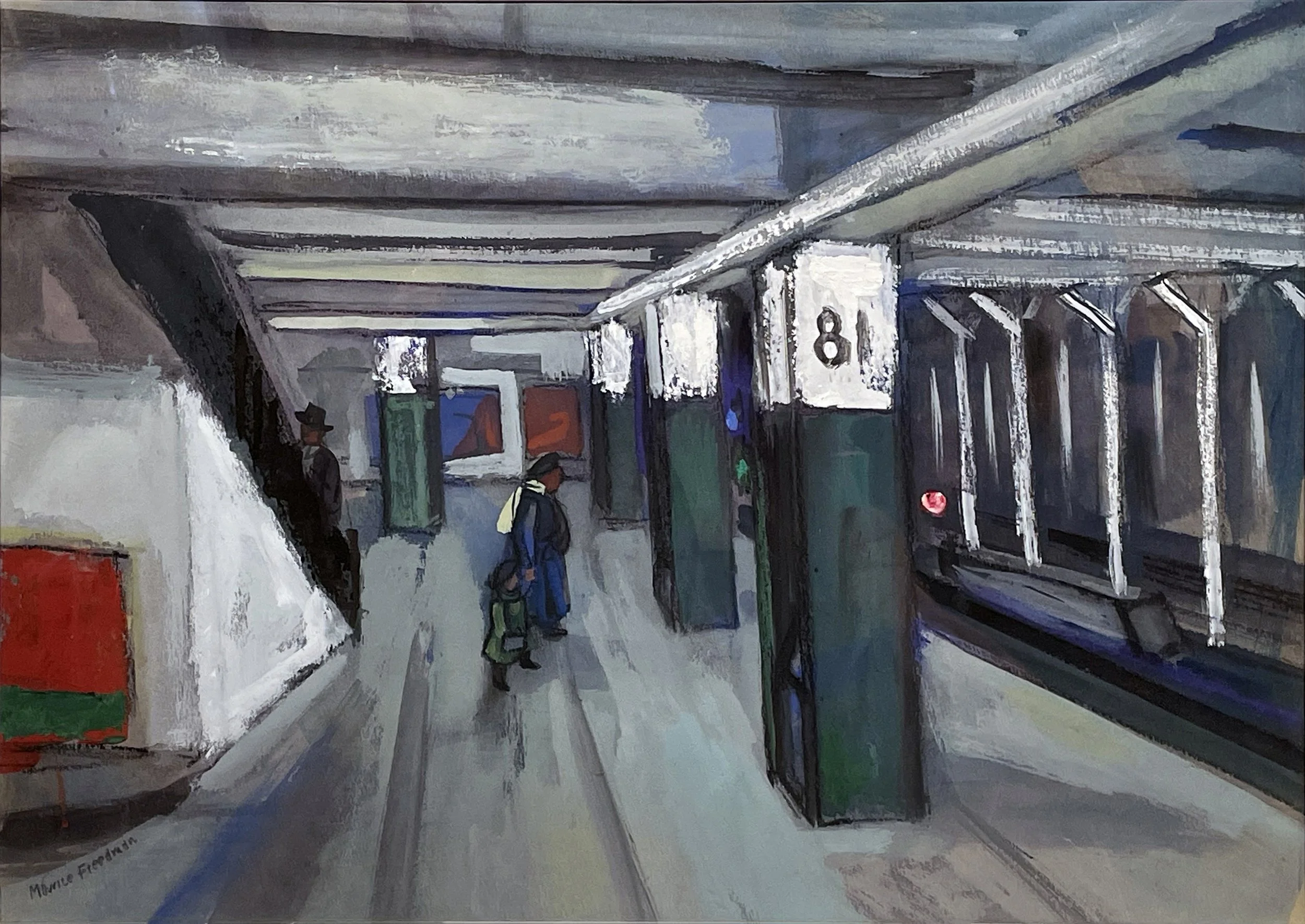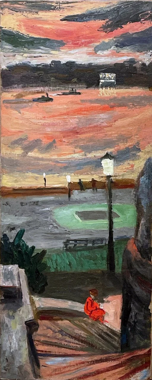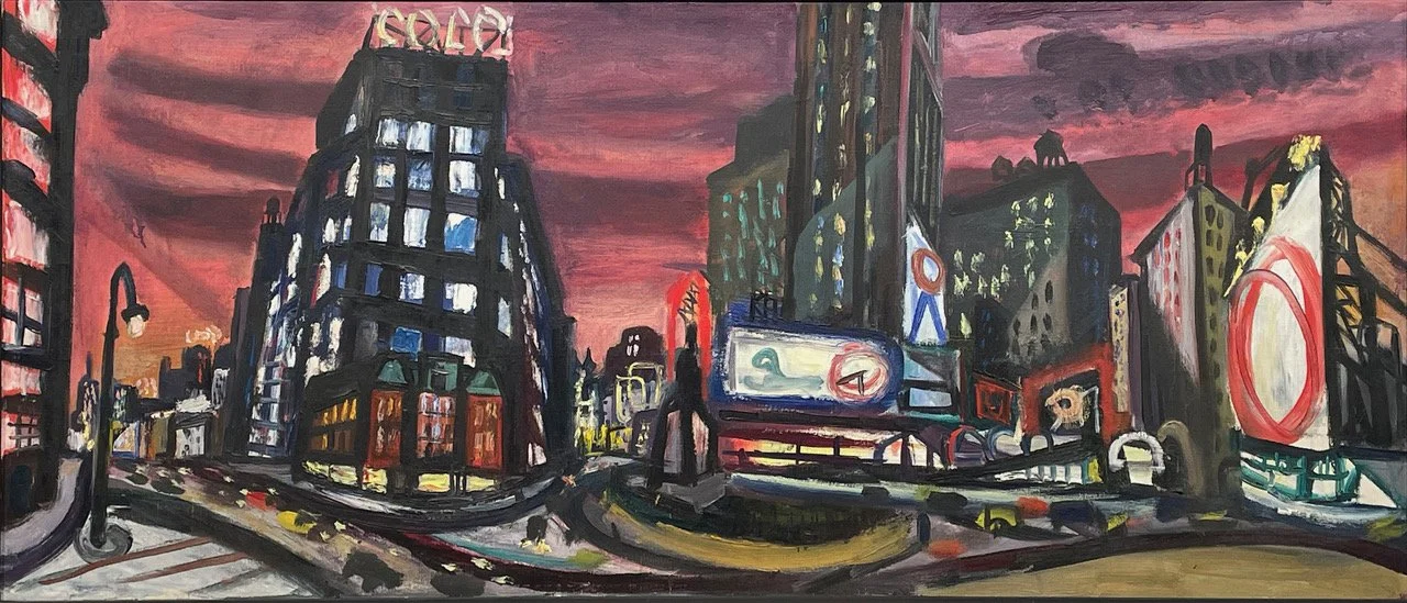 During his time abroad, Freedman studied the Cubist canvases of artists like Paul Cezanne to develop a style that married his already bravura technique with a new pictorial language, projecting multiple perspectives onto a single plane. From artists like Paul Gauguin and Henri Matisse, he learned to free his palette, ratcheting up the intensity of his colors to create syncopated rhythms of off-kilter hues as in “Entrance to Jordan’s Bar”, whose warm interior draws viewers away from the noisy, lurid strokes outside, into a brightly lit room beyond. In “Riverside Park,” he does something similar. Sweeps of a dusky mauve recreate twilight’s melancholy sway. But then Freedman counters the impending gloom with a fiery red figure, defiantly looking out from the canvas, under a streetlight’s high-pitched flow as if daring the night to descent.